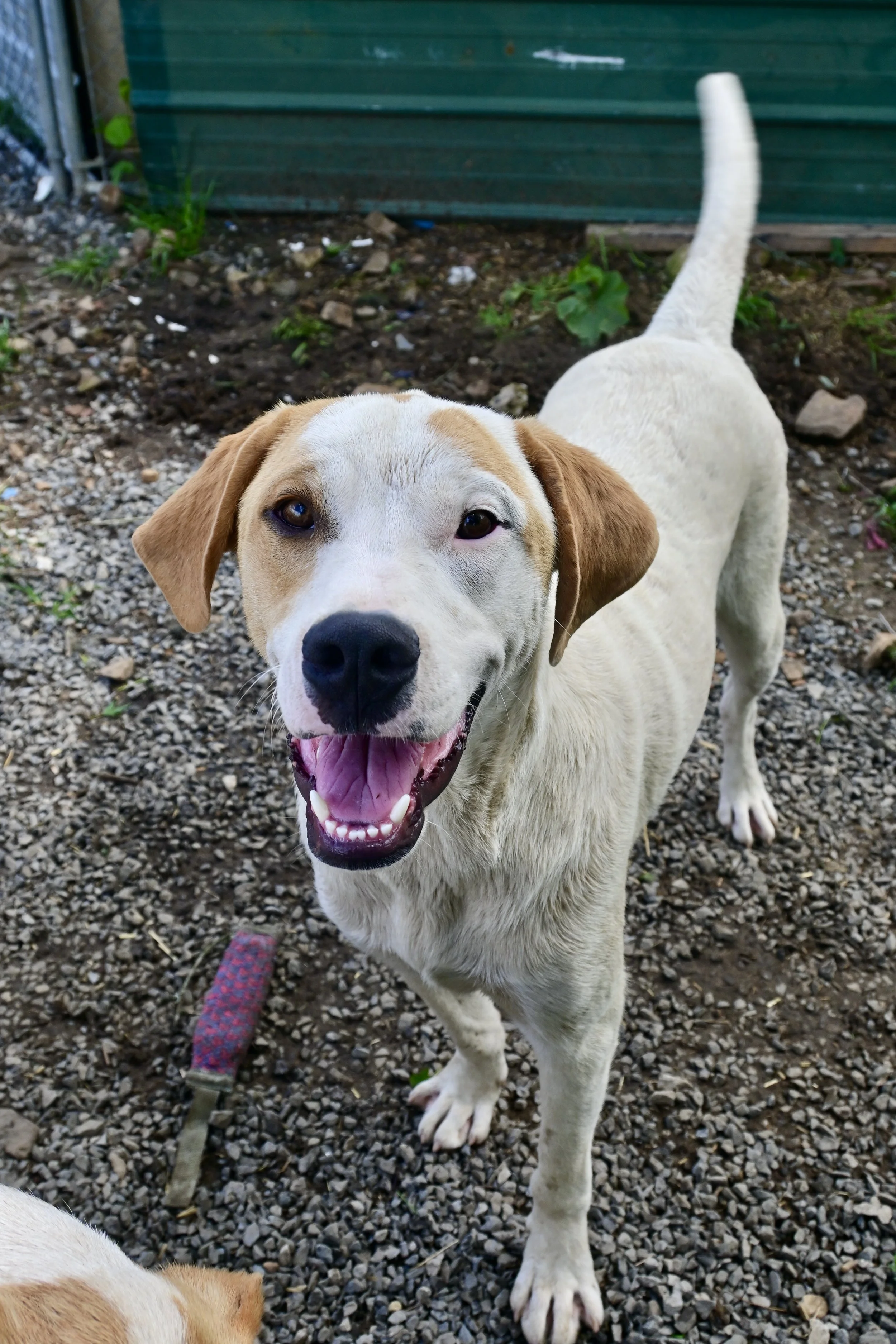 This boy was brought in as a stray and has been ready for a forever family. He loves to play! Definite Lab energy and attitude. He does get along with other dogs and has done well with strangers. He is learning the leash and how to behave on walks. He likes to play fetch and tug toys. He is a friendly boy for sure and would make a great playmate for energetic kids.