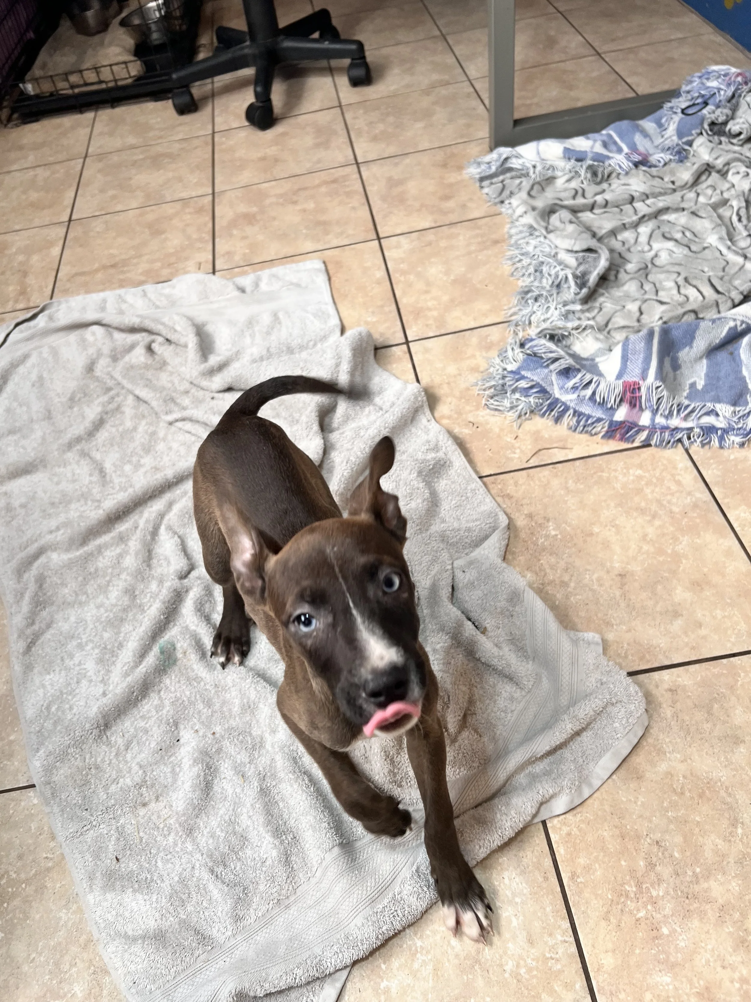 This boy was brought in with his siblings when their owners couldn’t care for them. He is a 2-eye colored sweetheart!! He does fine with other pups and likes people. He has energy and curiosity so will keep a family busy. He is ready to go to a forever home.
