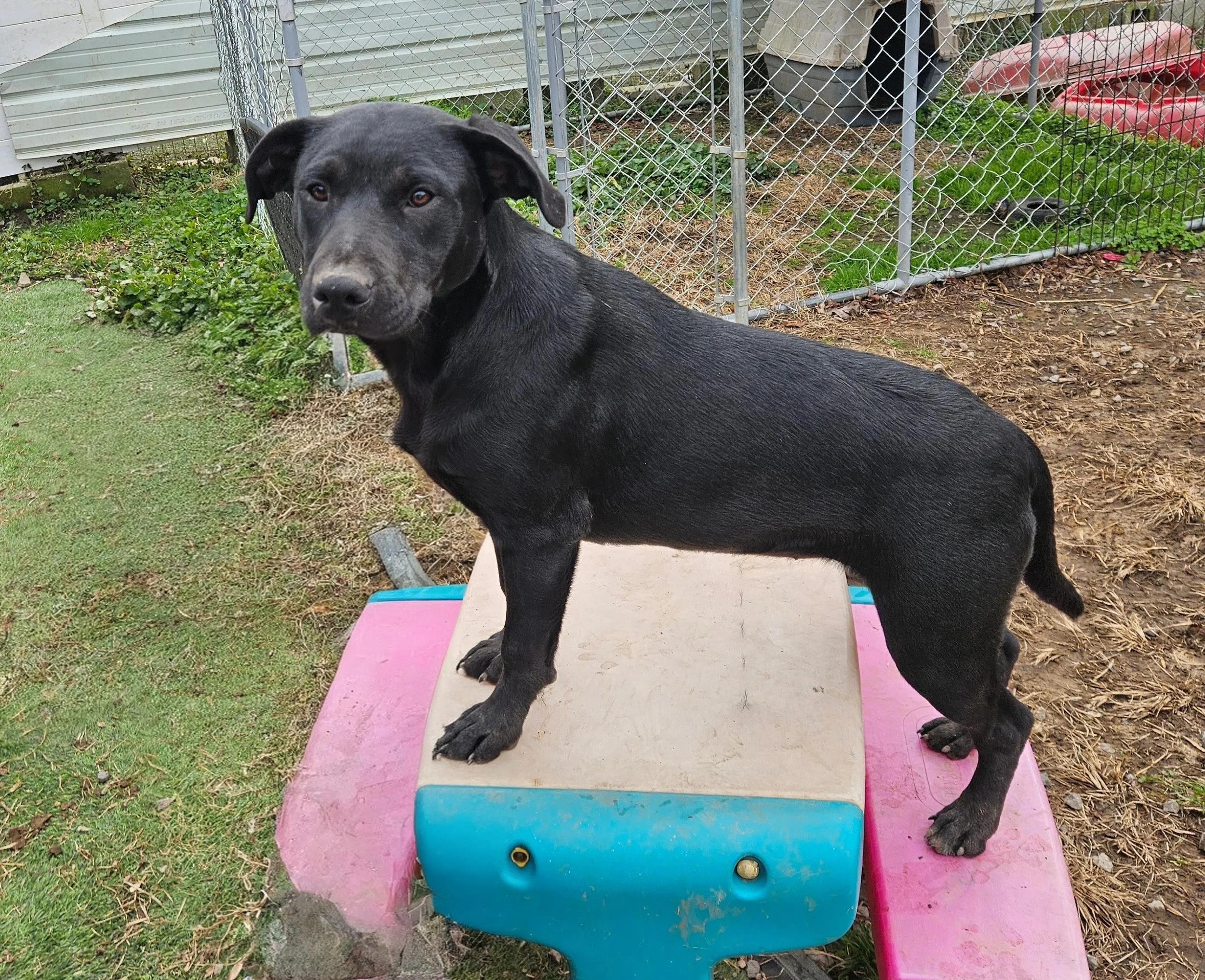 This is a fun girl!! She gets along with other dogs and cats. She can be shy with new people but does warm up to be a lovebug. She is housetrained with a dog door and will use puppy pads also. She is learning to play fetch but has not been on a leash. She is ready to go with a forever family.